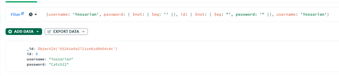 We are now well on our way. This query is searching for a Document where the username is Yossarian, and that the password is not empty, and finally that the id is not equal to ', password: '